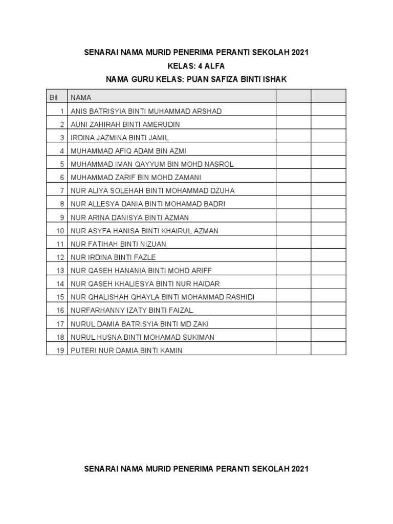 Senarai Nama Murid Penerima Peranti Sekolah 2021 Kelas 4 Alfa Nama Guru Kelas Puan Safiza Binti Ishak Pdf